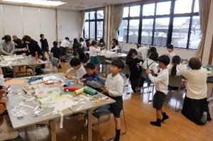 12月3日(水)技術教育支援センターの職員2名が津幡町条南公民館にて「大きい万華鏡、からくり屏風を作ろう」というテーマで出前授業を実施しました。参加者は小学1年生から小学5年生までの29名でした。真空内で金属片や紙切れが落下する様子や、お菓子の袋が膨らむ様子を観察しました。その後、低学年は大きい万華鏡、高学年はからくり屏風を作製して楽しみました。