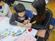 クラブ生は、お父さんやお母さんと一緒に、牛乳パックとストローを使って笛を作り、にぎやかなひと時を過ごしました。