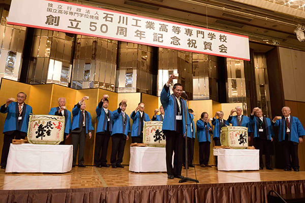 引き続き,村本校長と来賓14名による鏡開きが行われ,新谷隆二同窓会長の発声により乾杯し,創立50周年を祝いました。その後,馳浩文部科学大臣が多忙なスケジュールの中,祝賀会会場に到着し,大臣の石川高専創立50周年を祝うスピーチに会場は大いに盛り上がりました。