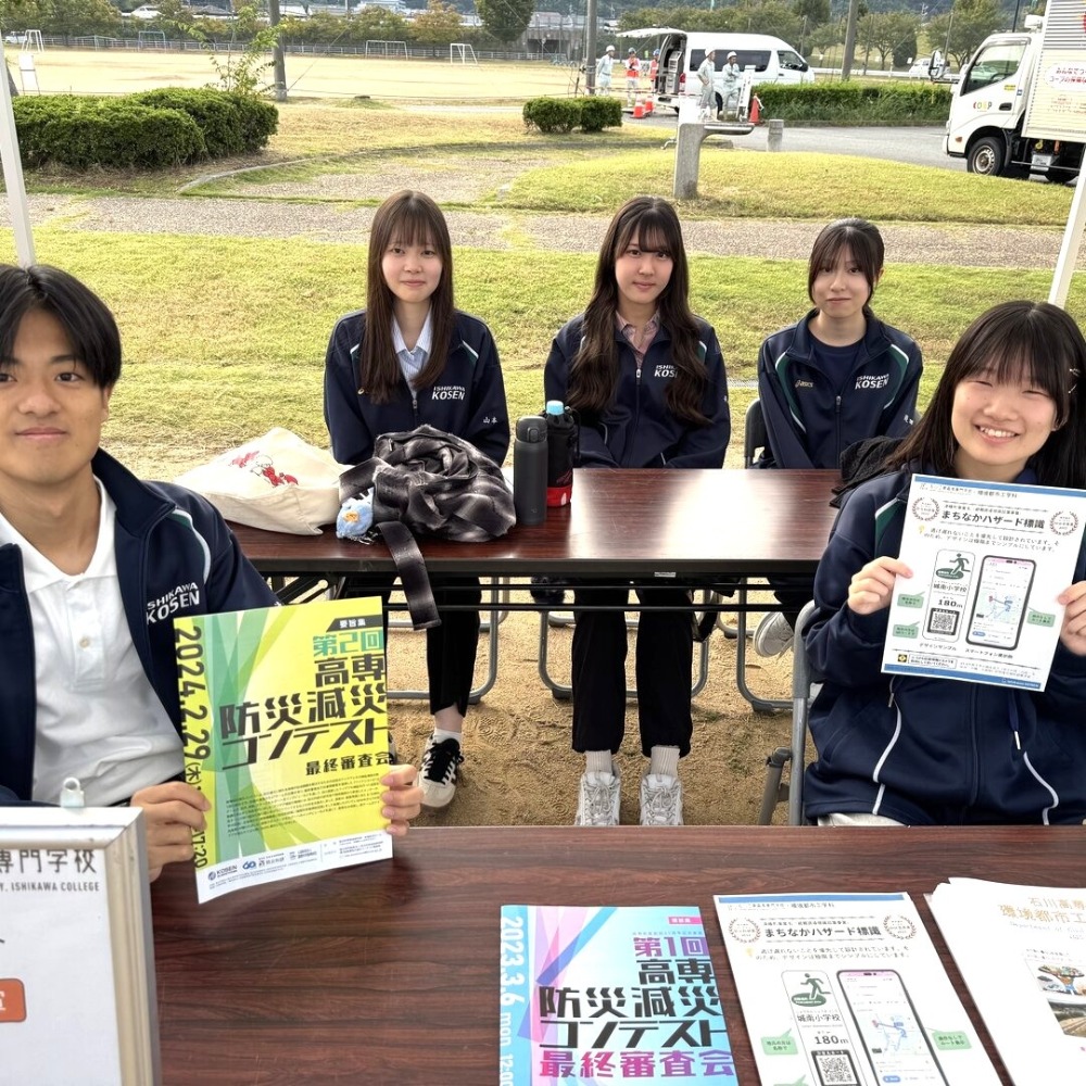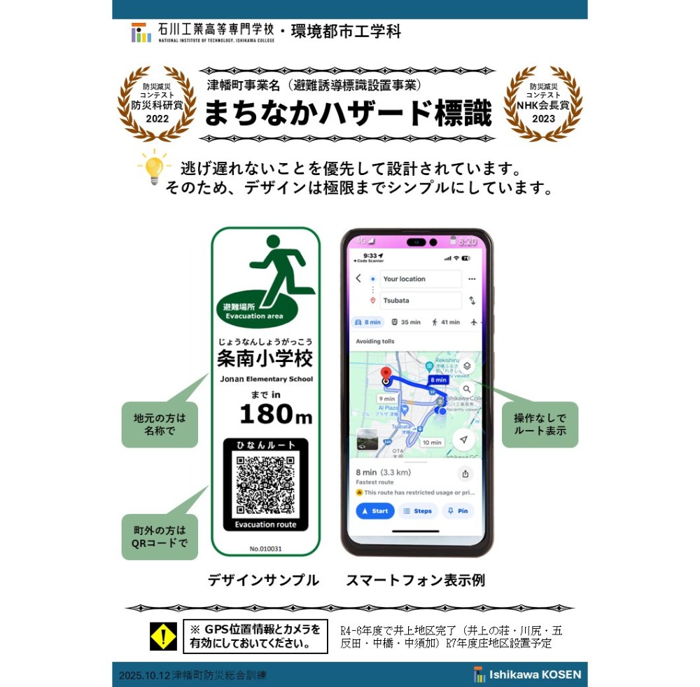 津幡町からの協力依頼を受け、本校が2023年より設置を進めている「まちなかハザード標識」に関する展示を実施しました。この標識は、環境都市工学科の学生たちが考案したもので、災害時に避難場所をわかりやすく示し、迅速な避難に活用してもらうことを目的としています。展示では、標識の活用方法を紹介するとともに、今後の設置活動への協力を呼びかけました。