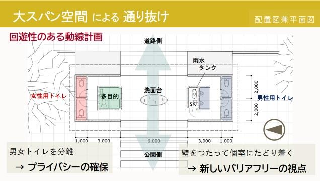 コンセプト:景観との連続を意識したゲート性を持ち、トイレを通過点として利用者の回遊性を高める