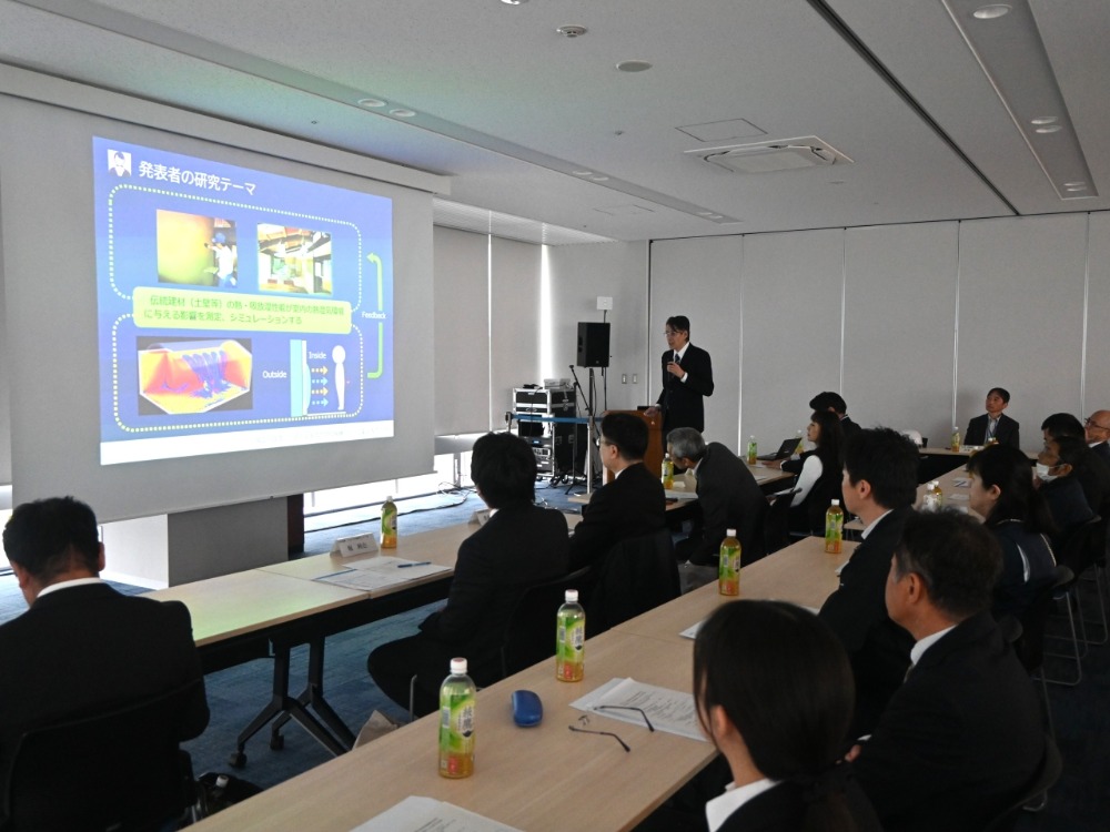 現場見学後は、本校建築学科 横林修造准教授より講演「能登産珪藻土の地域資源特性と震災後の採掘動向に関する実態調査-能登産珪藻土の吸放湿特性を活かした建材・製品開発に向けて-」が行われました。講演では、地域の生活文化における能登産珪藻土の役割や、能登産珪藻土の起源と地域資源特性、地場企業による製品化への取り組み、そして能登半島地震後の採掘状況などについての紹介がありました。
