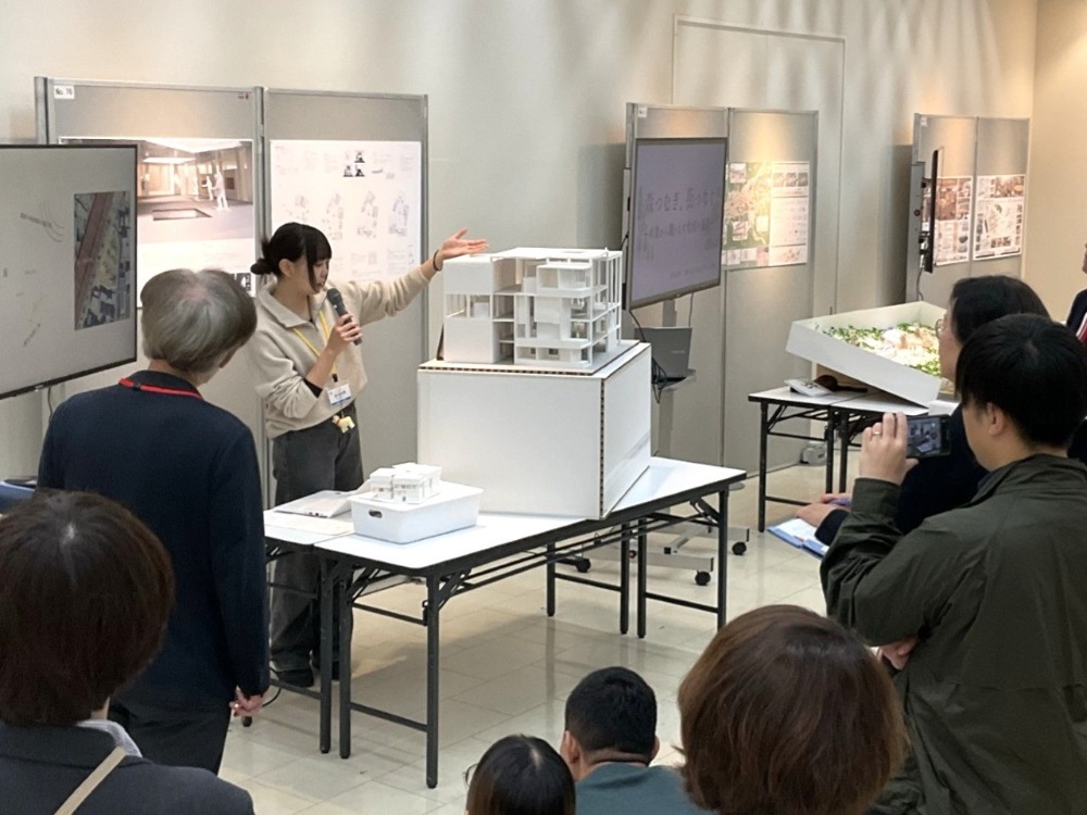1日目に5分間のポスターセッションと質疑応答、2日目に6分間のプレゼンテーションを実施。審査の結果、「すれ違いの共生」をテーマに提案した建築学科3年・上野さんの作品が「三菱地所コミュニティ賞」を受賞しました。