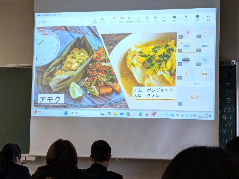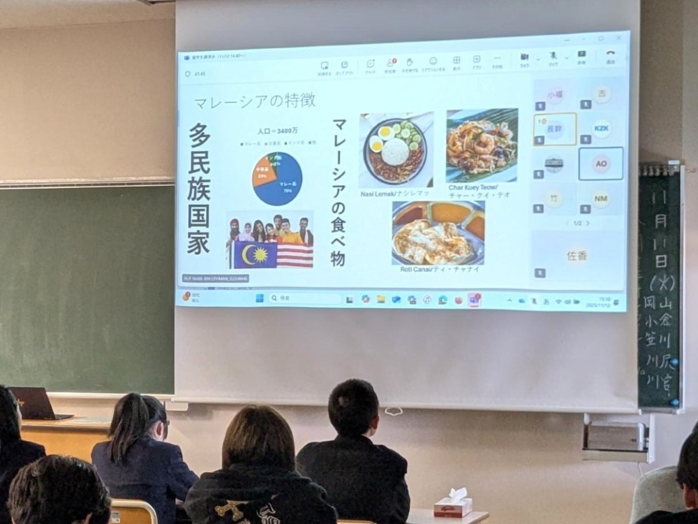 2025年11月12日(水)、2年生合同特活(2年生5学級共通特別活動)にて「留学生講演会」をオンラインで開催しました。