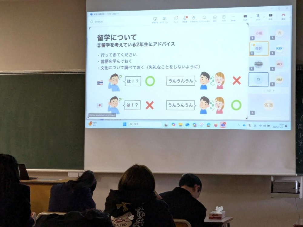 講演後には、学生たちから多くの質問が寄せられ、留学生の出身国と日本の違いや、留学に対する考え方について熱心に耳を傾けていました。