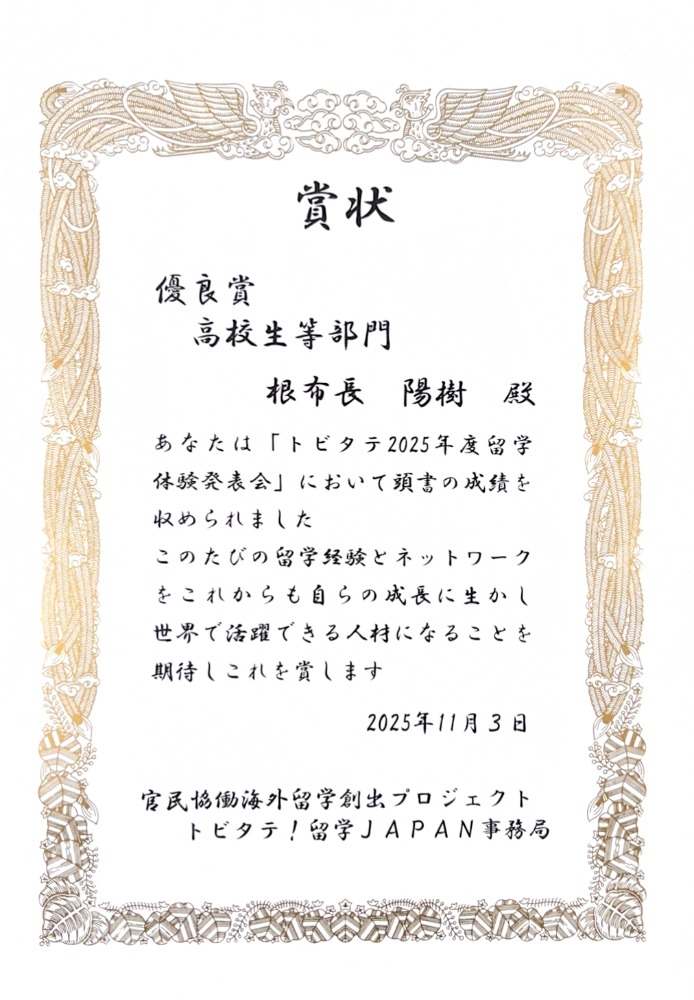 「トビタテ!留学JAPAN 2025年度留学体験発表会」で優良賞受賞!