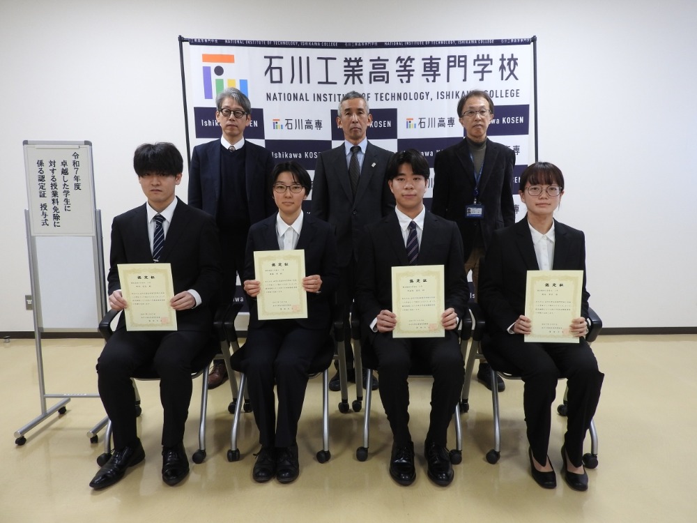 この授業料免除は、独立行政法人国立高等専門学校機構が制定した制度で、本校では、専攻科生のうち、学業成績が極めて優秀な学生を対象として実施しています。