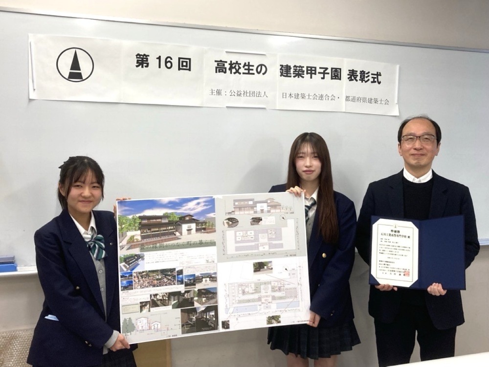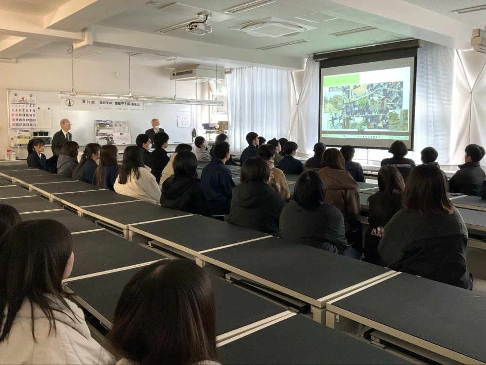 日本建築士会連合会および都道府県建築士会が主催する2025年(第16回)高校生の「建築甲子園」において、建築学科3年・河原怜愛さん・児玉葉月さんの提案作品が準優勝を受賞しました。これを受け、2026年1月28日(水)には石川県建築士会の関係者が来校し、表彰伝達式が行われました。当日は、クラス全員で最終プレゼン動画を視聴した後、最終審査講評が紹介されました。