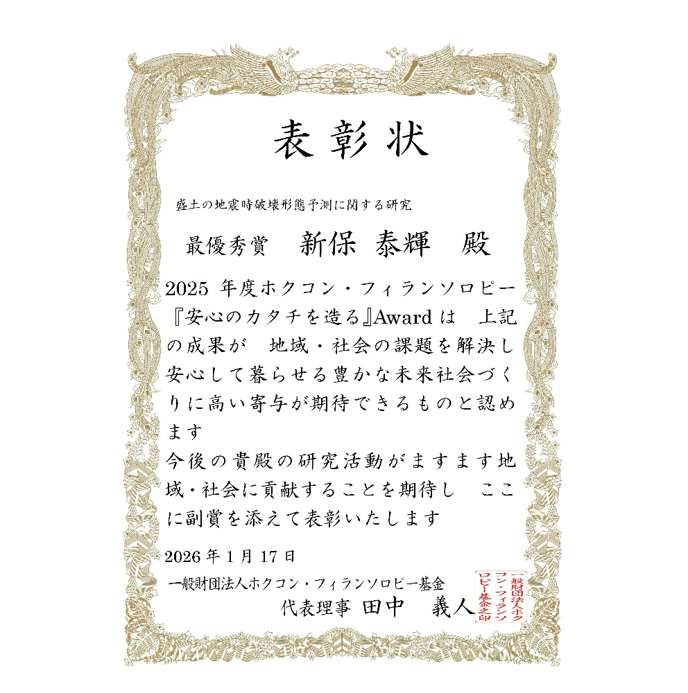 2026年1月17日、環境都市工学科の新保泰輝教授が、2025年度ホクコン・フィランソロピー『安心のカタチを造る』Awardにおいて最優秀賞を受賞しました。