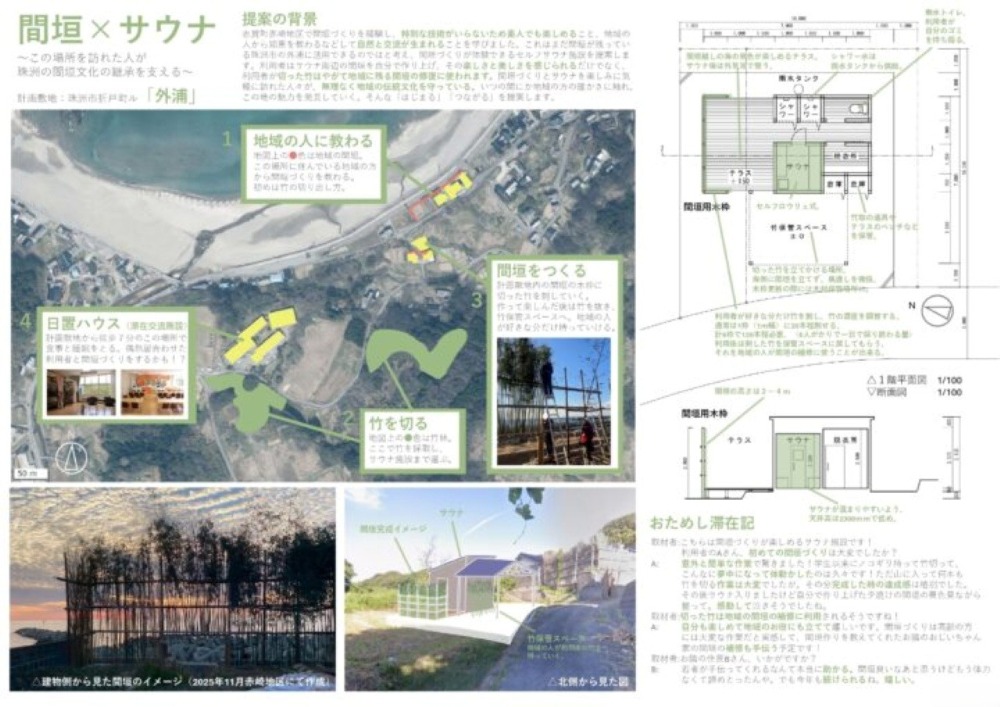 審査員からは、「利用者のアクティビティが地域の人々の生活の役に立つものとしても活用できる計画となっており、体験のデザインも含めた提案となっている。地域の人々から竹を切るところから教わり、間垣を作る/サウナを楽しむ拠点に滞在し、食事と睡眠は既存の滞在拠点施設を活用するという思い切りの良さも、現実的なアイデアとして腑に落ちた。」と高い評価を受けました。