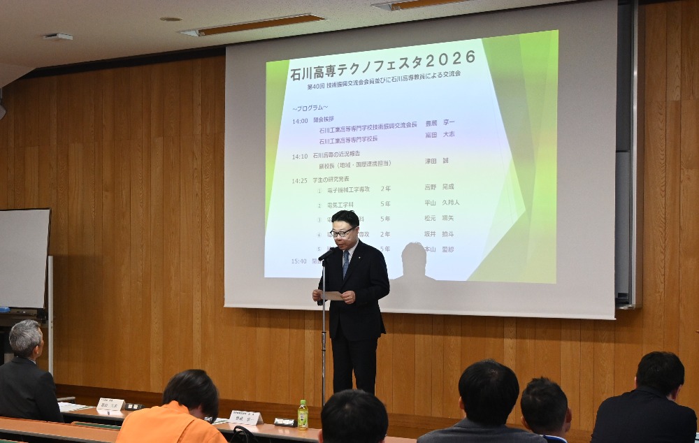 2026年3月24日(火)、技術振興交流会会員および本校教職員を対象とした「テクノフェスタ2026」を本校視聴覚教室にて開催し、企業会員37社から62名、本校教職員25名の計87名が参加しました。今年度は、本校の近況報告および学生による研究発表が行われました。