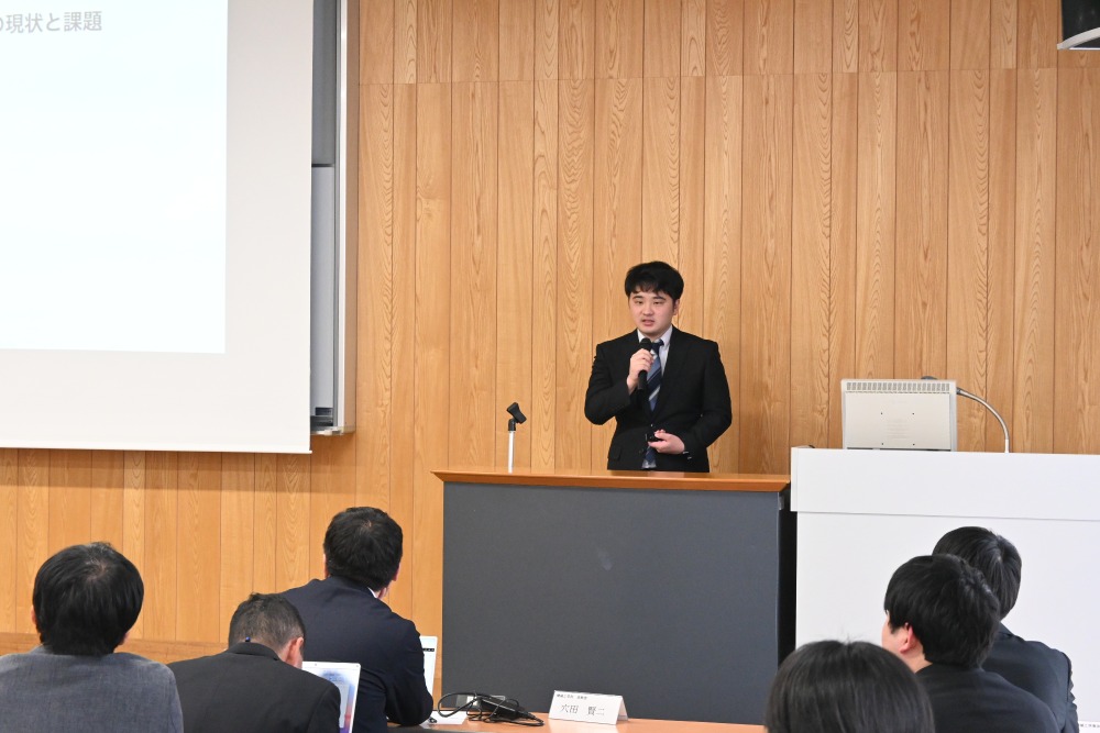 続く学生発表では、電子機械工学専攻2年・高野晃成さん、電気工学科5年・平山久羚人さん、電子情報工学科5年・松元颯矢さん、環境建設工学専攻2年・坂井拍斗さん、建築学科5年・本山愛紗さんが、それぞれが取り組んだ研究内容について発表を行いました。