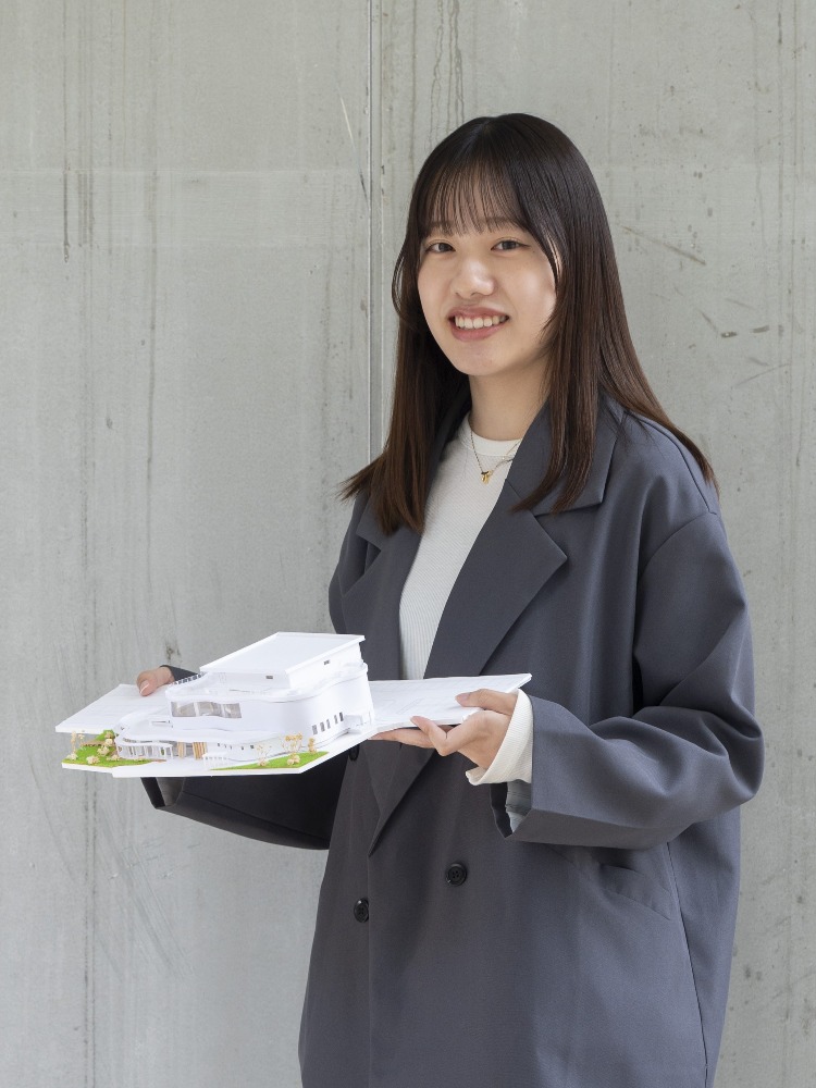 私は、小学生の頃から建物の設計に興味を持ち始めました。早いうちから図面を描いたり、専門知識を学べることに魅力を感じ、高専に入学しました。設計の授業では、建物そのものだけでなく、周辺環境や町全体に配慮して、様々な視点から設計をします。時間をかけてできた作品が模型として形になると、達成感と共に、作品に愛着が湧きます。また、作品の発表では、他者により伝わりやすくするために、CADソフトを利用することもあります。
