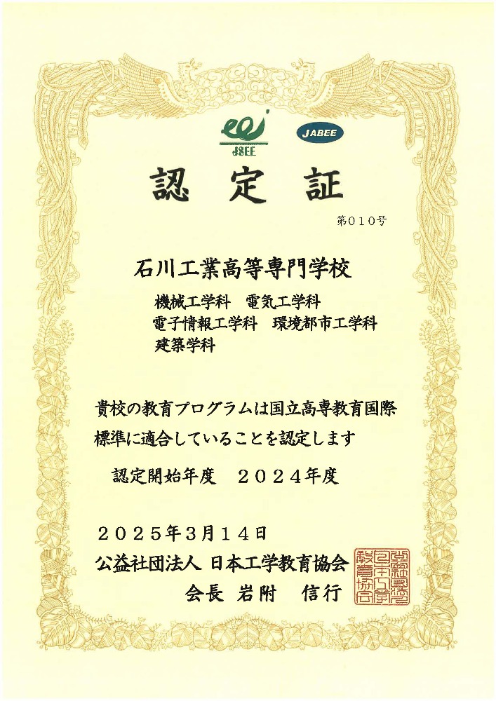 この制度は、工学教育の1つの柱である高等専門学校(高専)の5年間の本科教育に対して、国際的な教育の質保証の枠組みである「国立高専教育国際標準 (KOSEN International Standard:KIS) 」に基づく質保証を行うことで、高専の本科教育の質保証を国内外に対して明示することを目的に、2022年度に開始された認定制度です。