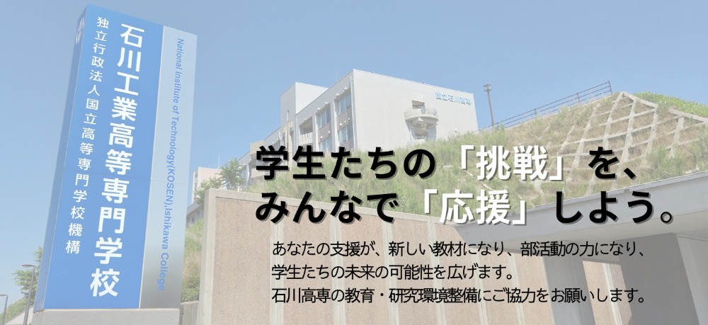石川工業高等専門学校では、本校の教育・研究活動の一層の充実と発展を図るため、さまざまな目的に応じた寄附金を募集しております。これらの寄附金は、学生支援、教育環境の整備、研究活動の推進などに活用させていただきます。